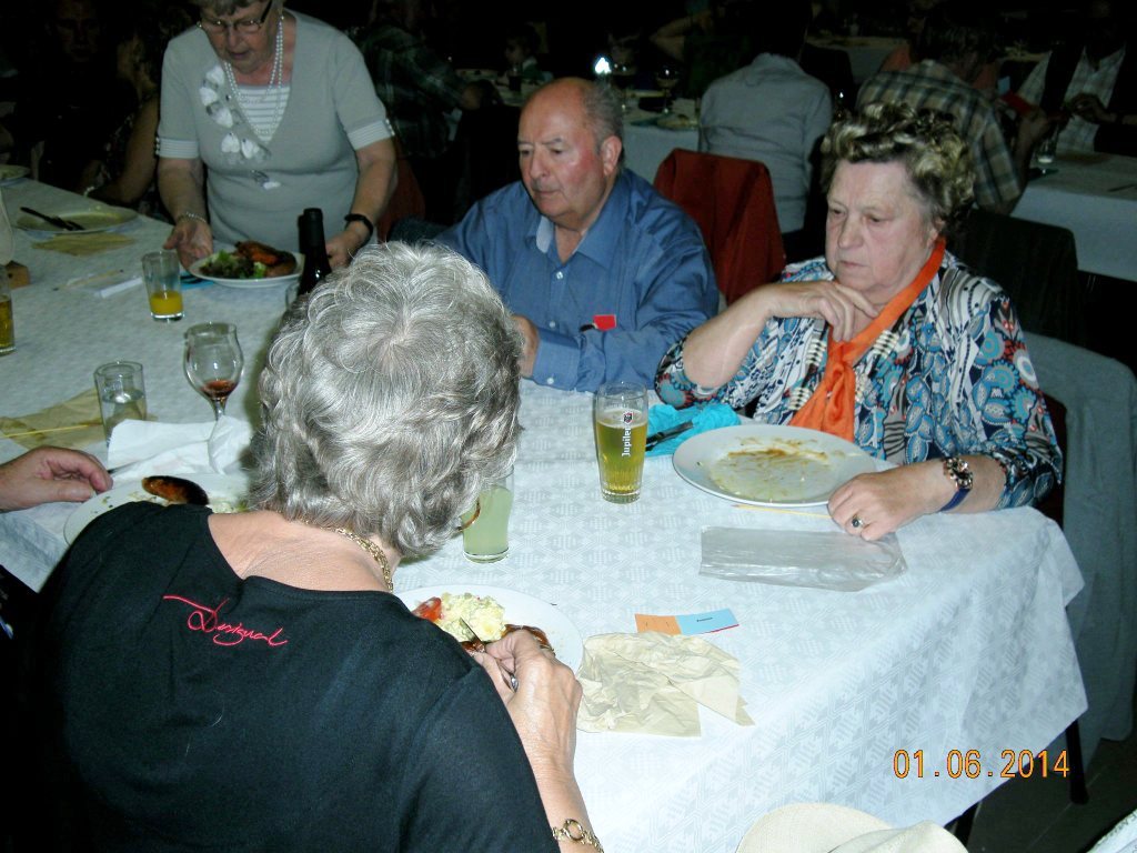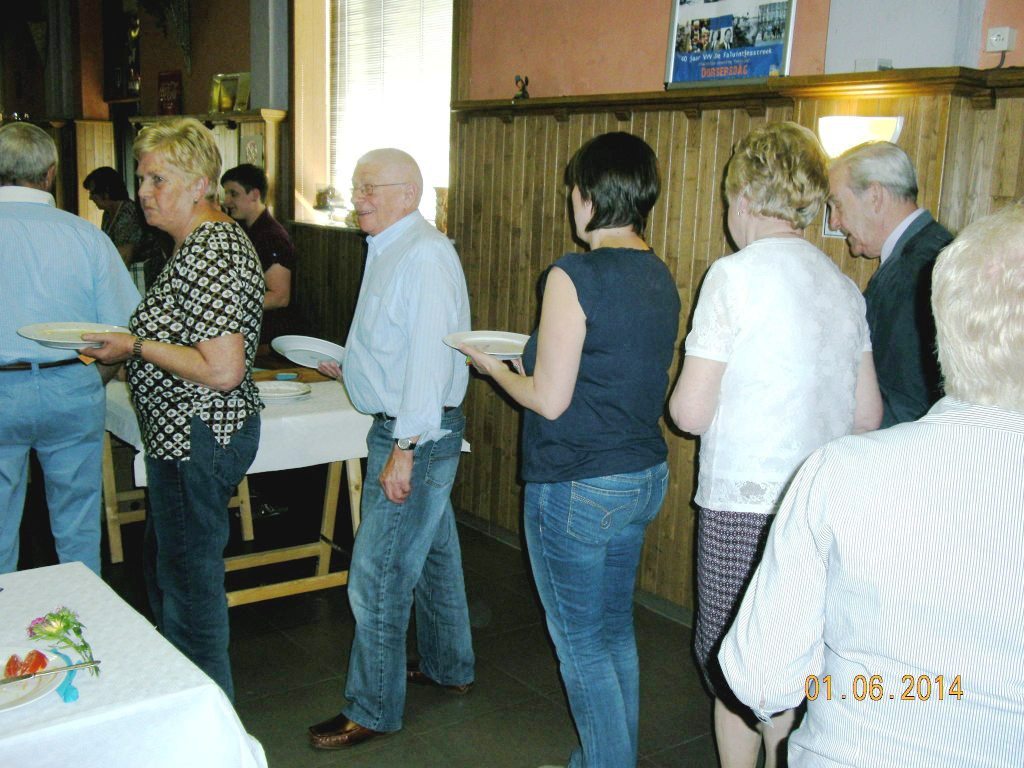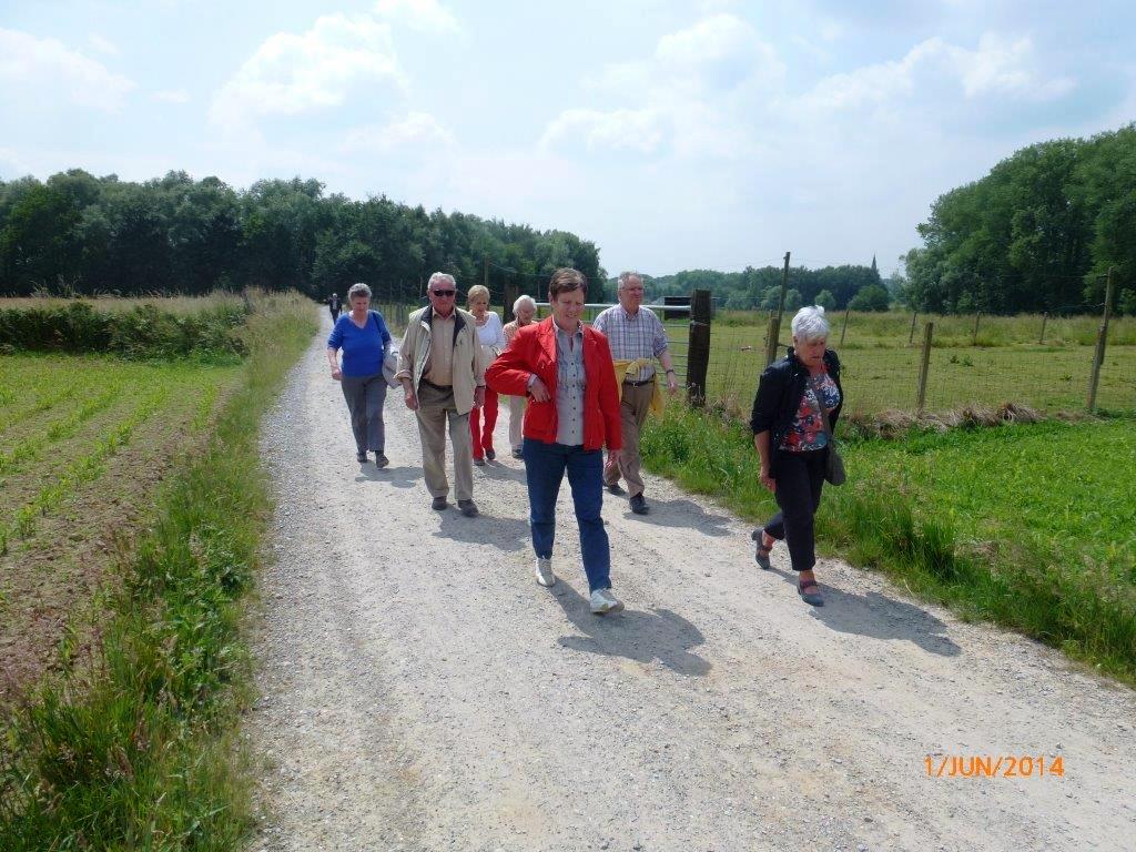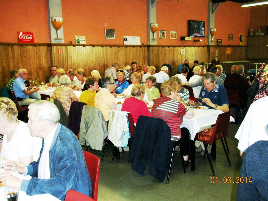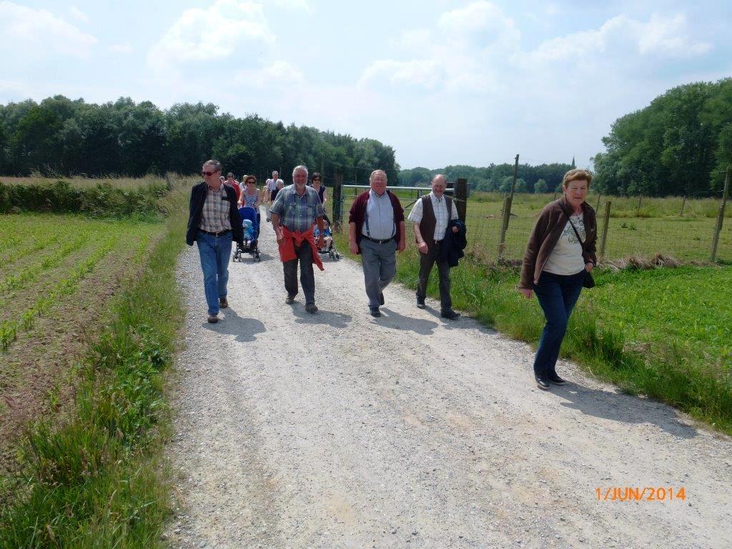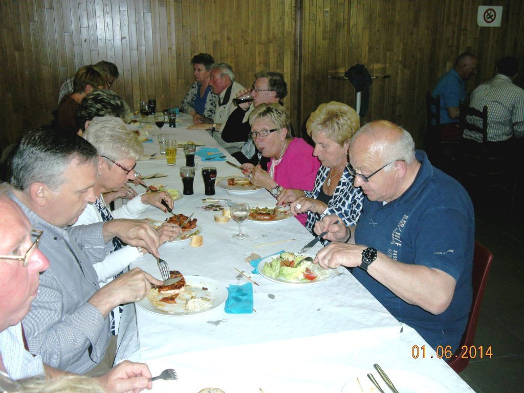 Meldert, zondag 1 juni 2014. Het weer viel mee niet alleen om te wandelen maar ook om de barbecue buiten op te stellen. Ruim 109 deelnemers mochten genieten van de natuur (wandelen)kaarten en smullen van de lekkere worsten, brochettes en koteletten. Peter Merckx (eveneens gepensioneerd) zorgt reeds 8 jaren voor 'n perfecte service, samen met zijn vrouwtje Huguette en familie.
